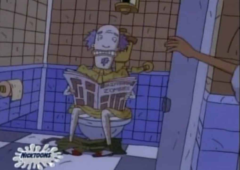 Later on, in the same bathroom, he hears a conversation between Ickis, Krumm, and Oblina about the human "flashing" Ickis (taking his picture). He is confused at first but then shrugs at the viewers and goes back to reading his newspaper on the toilet.